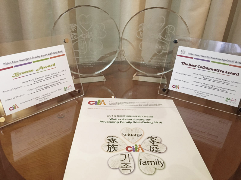 • 2016 The “Bronze Award” and “The Best Collaborative Award”, Wofoo Asian Award for Advancing Family well-being 2016, Consortium of Institutes on Family in the Asia Region (CIFA) to “Pregnant Psychotropic Substance Abusers Supporting Scheme: An integrated program to drug-abusing mothers in KEC” by CCDS